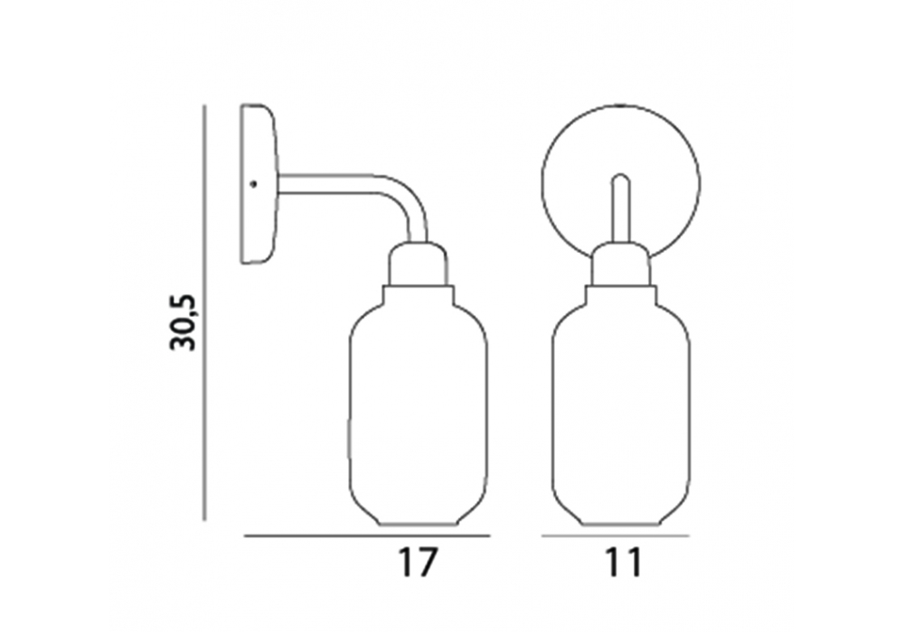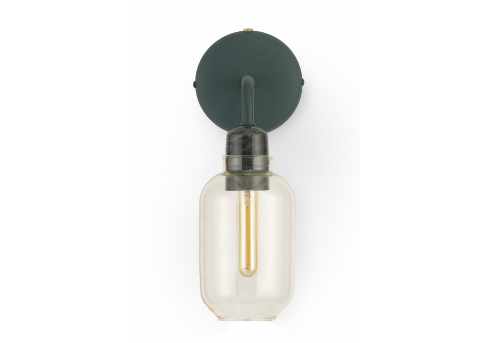 Amp firmata da Simon Legald per Normann Copenhagen è una lampada da parete, con attacco a parete e struttura in metallo verniciato a polveri di colore verde o nero. Il paralume è di forma cilindrica in vetro ancorato al portalampada in marmo, ed adotta una sorgente luminosa di tipo LED (non inclusa) alimentata da un cavo in fibra tessile nello stesso colore della struttura. Amp è disponibile in due finiture, verde con paralume dorato, o nera con paralume fumè.