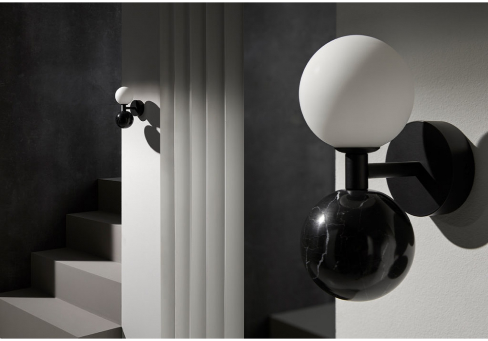 Dalt firmata da Pepe Fornas per Aromas del Campo è una lampada da parete composta da struttura in metallo, decoro in marmo e paralume in vetro opalino.