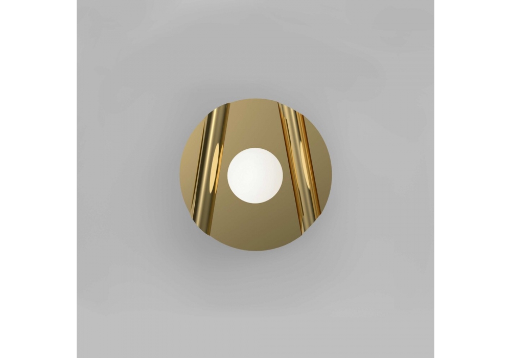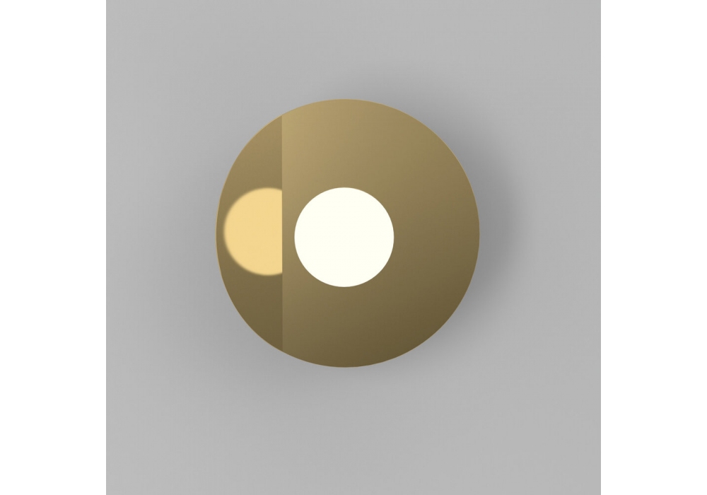 Disc and Sphere Intersecting/Bent firmata da Atelier Areti è una lampada da parete realizzata in ottone lucido, attacco in metallo verniciato bianco o nero e diffusore in vetro bianco. Disponibile in diversi modelli.