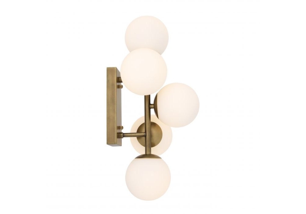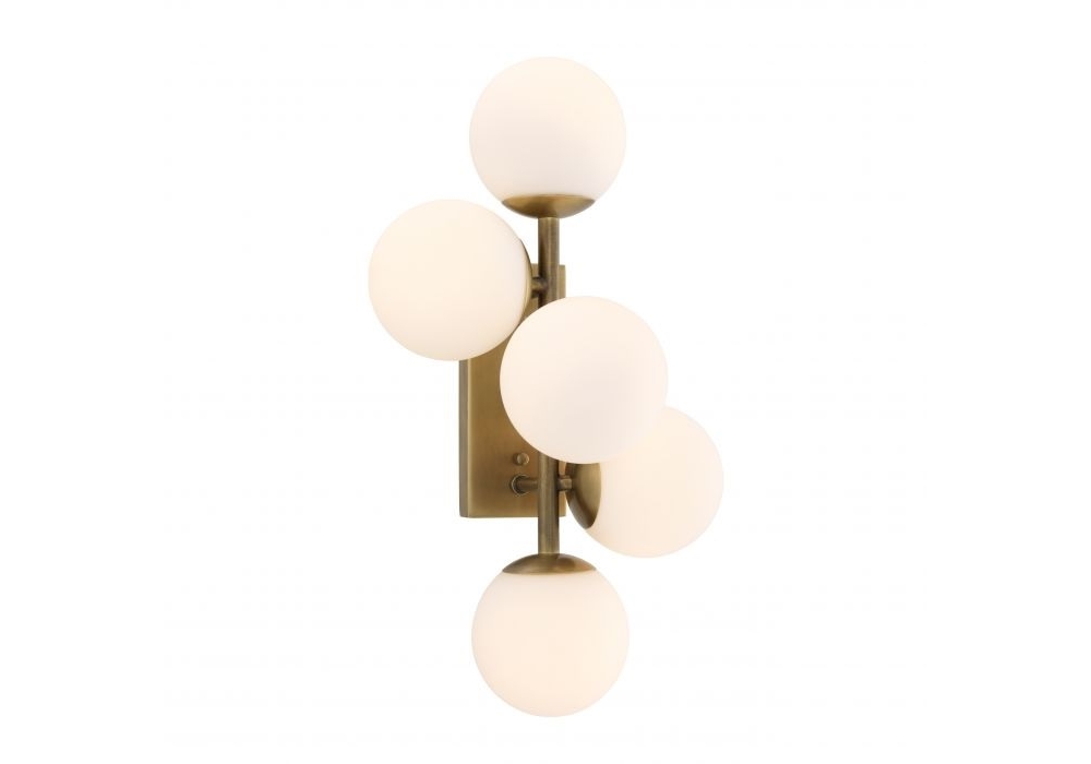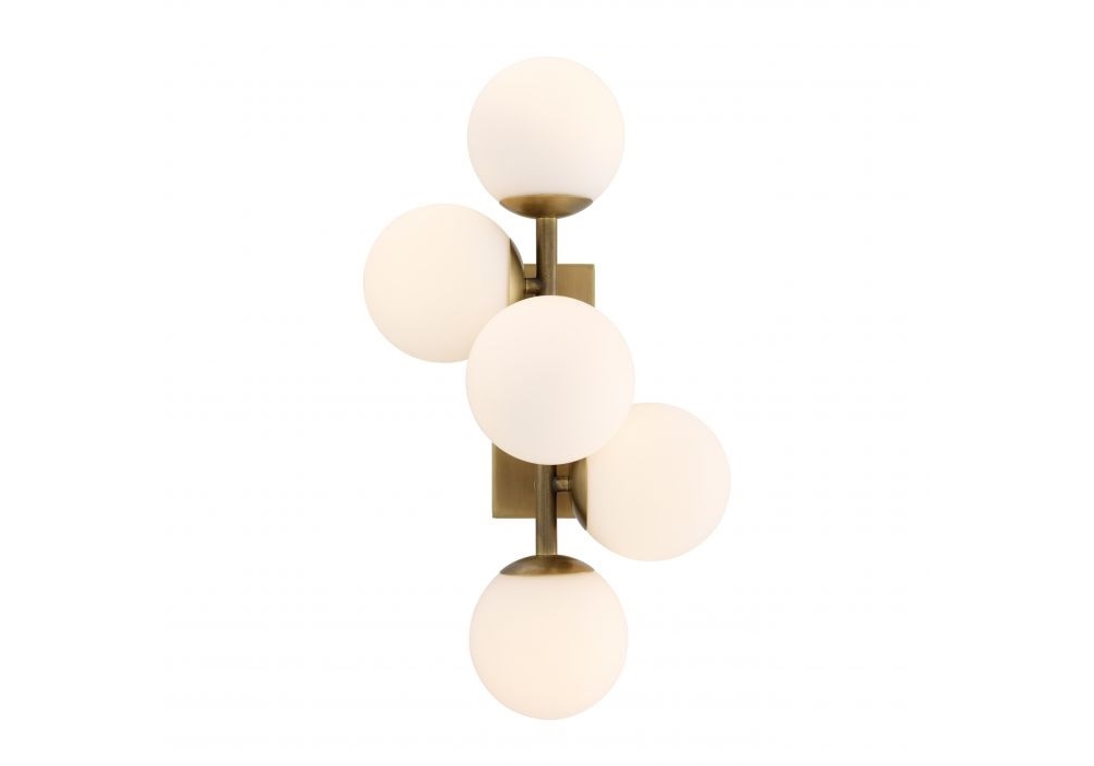 Wall Lamp Libris firmata da Eichholtz è una lampada da parete dalla finitura in ottone anticato con quattro paralumi sferici in vetro bianco che diffondono una luce calda e morbida in tutta la stanza.