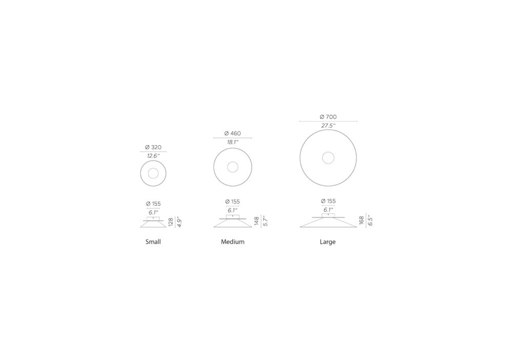| Diffusore | Ø 32 x H 12,8 cm; Ø 46 x H 14,8 cm; Ø 70 x H 16,8 cm. |