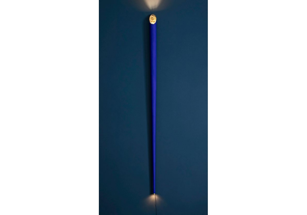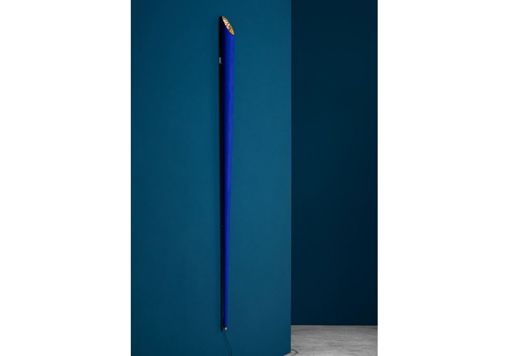 Cono W firmata e prodotta da Catellani&Smith è una lampada da parete con alimentazione esterna. La struttura è un cono in metallo verniciato a mano colore blu, interno irregolare rivestito in foglia color oro. Il cavo è di colore nero.