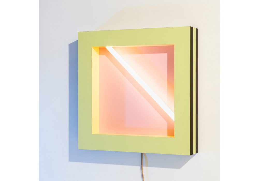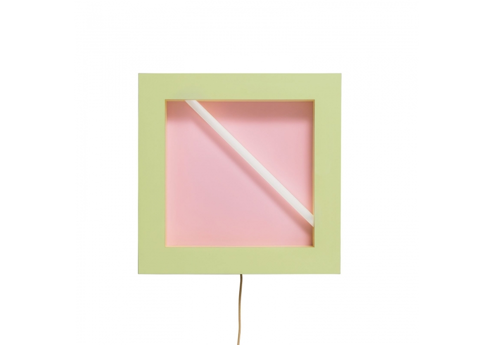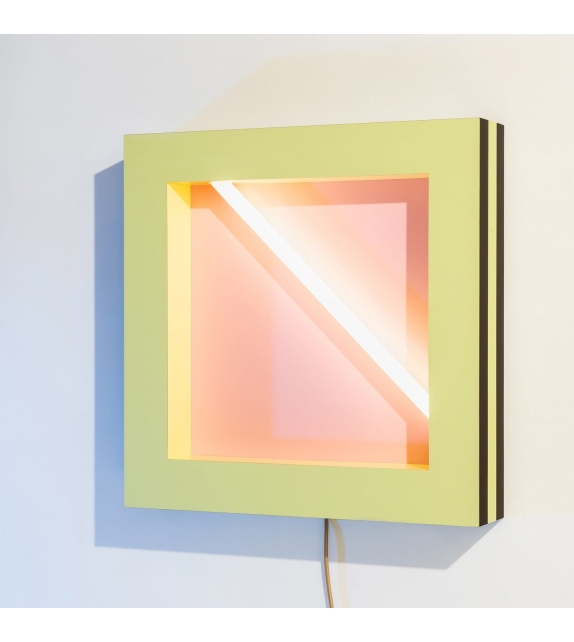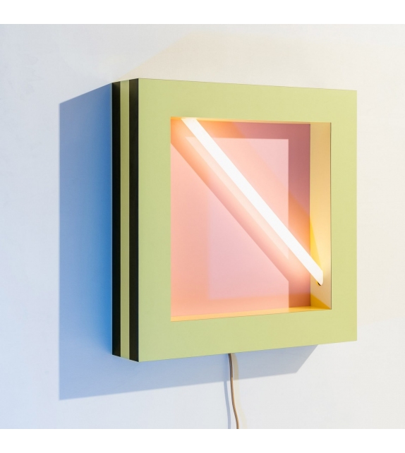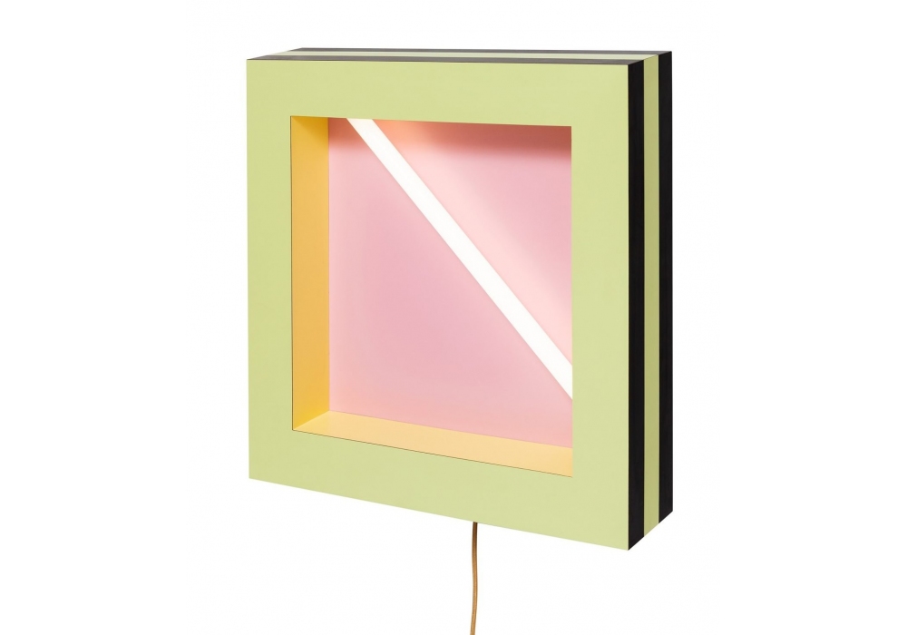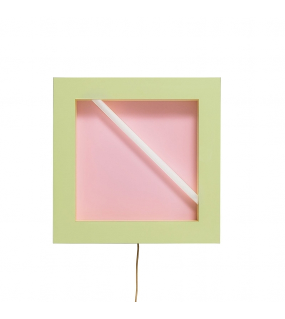 Negresco firmata da Martine Bedin per Memphis Milano è una lampada da parete in legno rivestita in laminato decorativo.