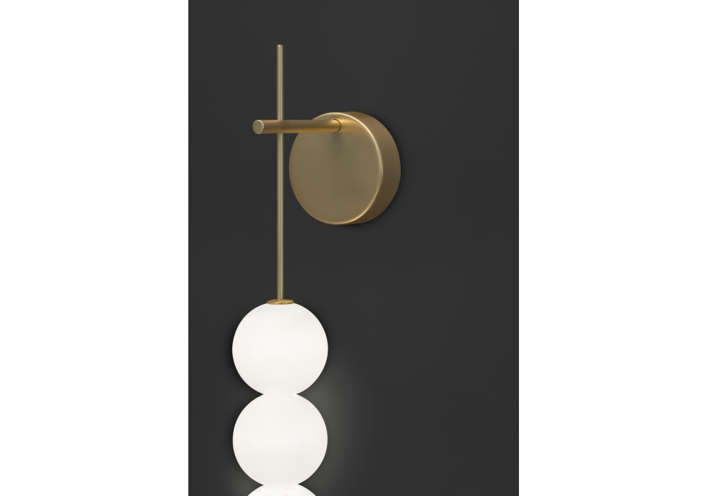 Abacus firmata da Draw per Terzani è una lampada da parete con struttura portante in metallo nella finitura ottone satinato. I diffusori sono di forma sferica in vetro soffiato opalino e schermano una sorgente luminosa di tipo LED integrato dimmerabile o non dimmerabile.