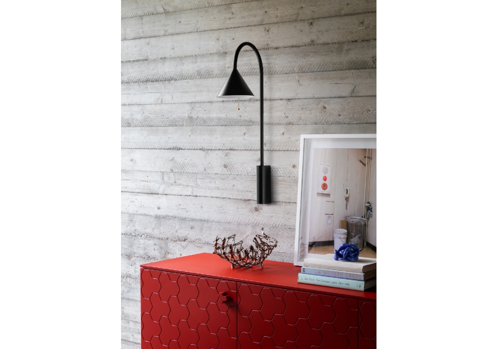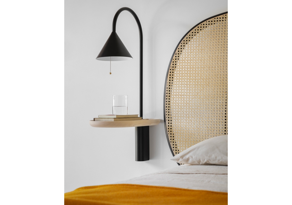 Ozz Wall S firmata da Paolo Cappello & Simone Sabatti per Miniforms è una lampada da parete realizzata in metallo nero, disponibile con mensola in frassino naturale o senza.