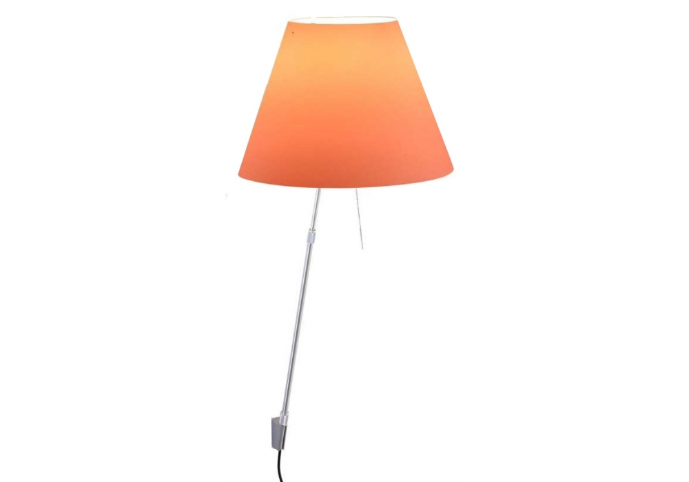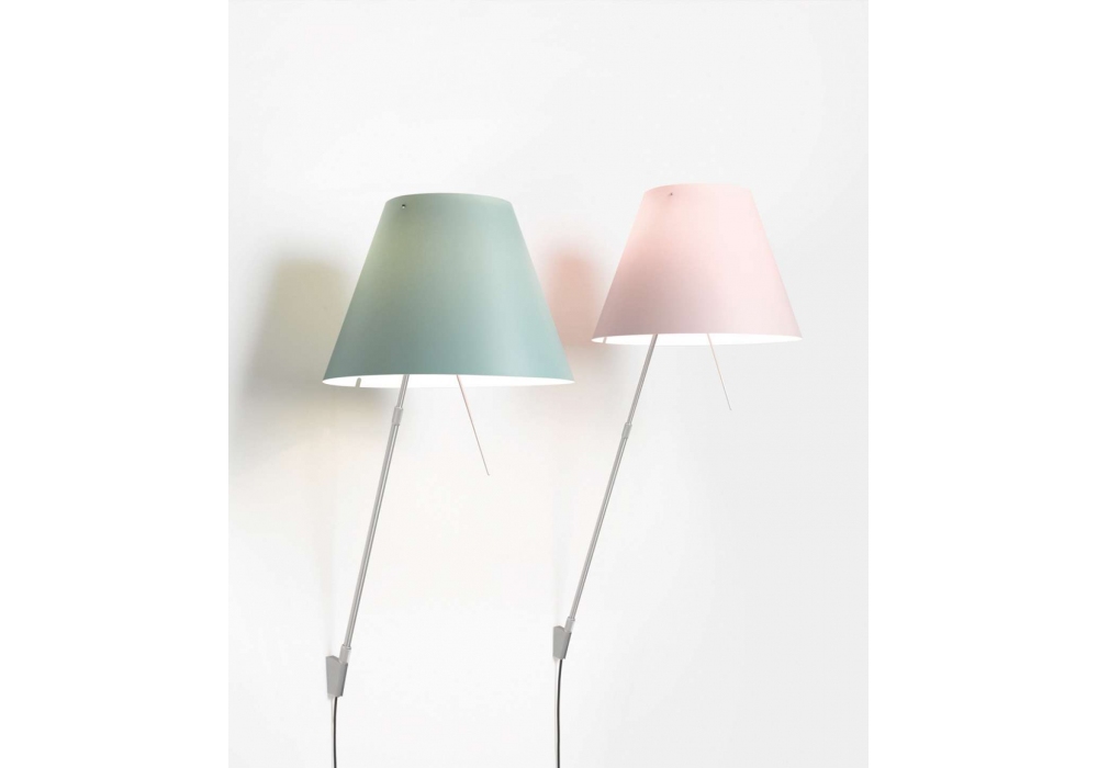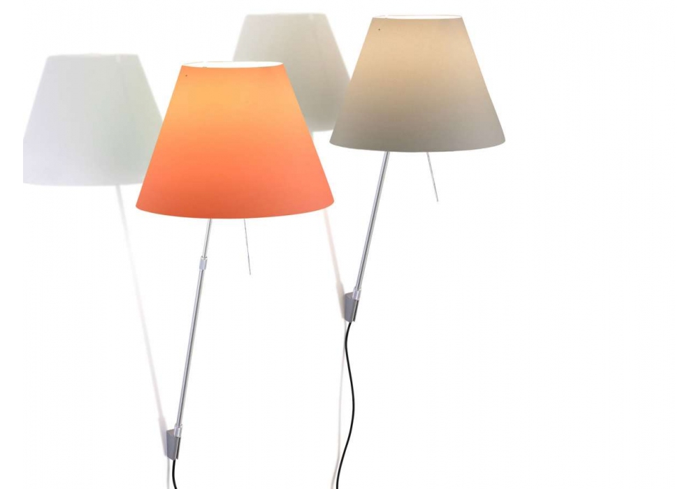 Costanza firmata da Paolo Rizzatto per Luceplan è una lampada da parete con stelo in alluminio, fisso o telescopico e paralume intercambiale in policarbonato serigrafato. Adattatore a parete in alluminio in tinta alla struttura.