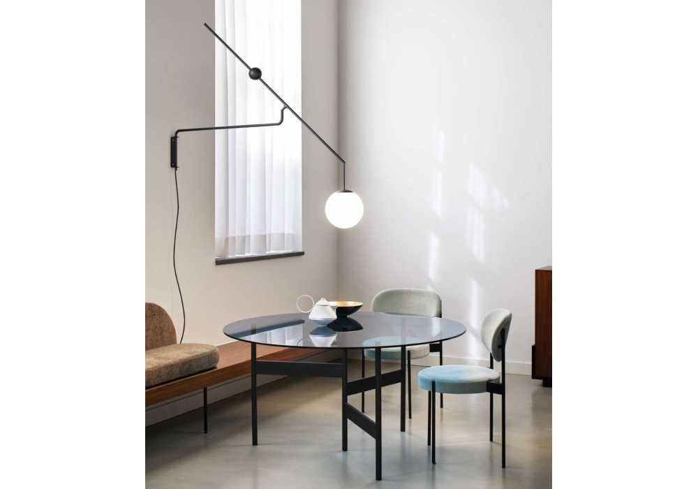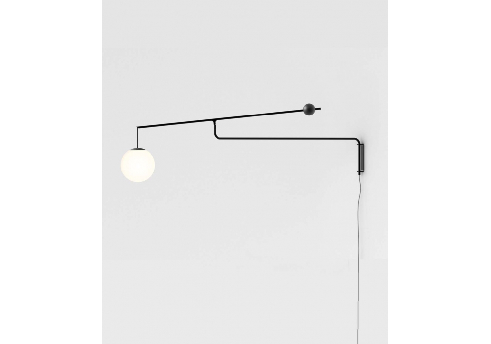 Malamata firmata da Shulab per Luceplan è una lampada da parete con struttura in acciaio nero opaco o ottone spazzolato e diffusore in vetro soffiato bianco opale. Sfruttando il movimento del contrappeso è possibbile direzionare il diffusore.
