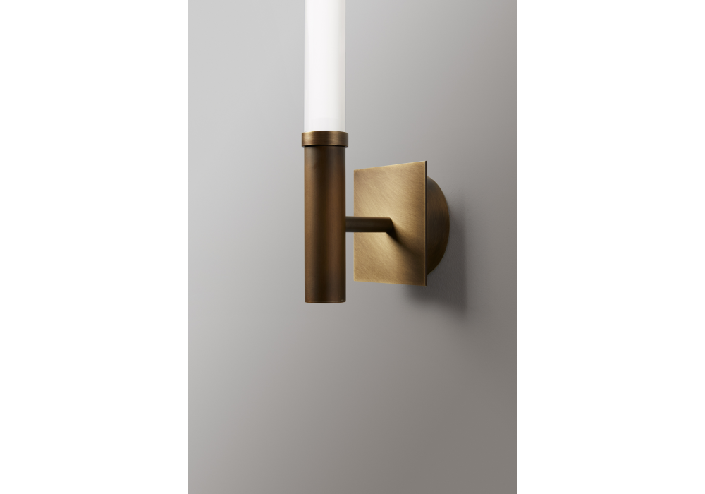 Root One Slim firmata da Massimo Tonetto per Venicem è una lampada da parete a luce indiretta. Struttura in ottone brunito spazzolato e diffusore in vetro soffiato di Murano bianco lucido.