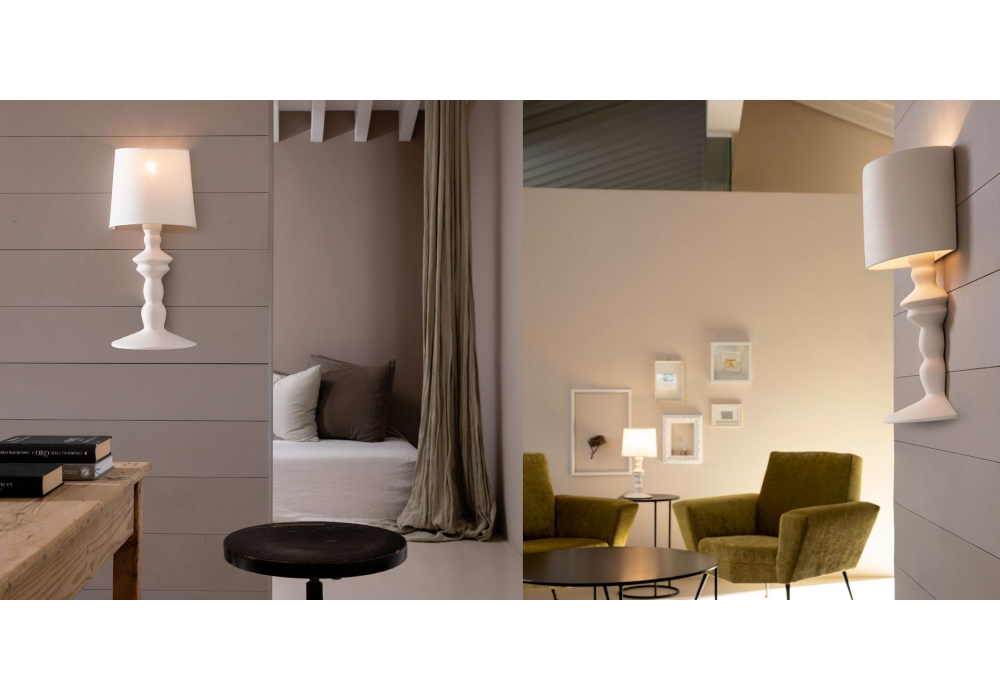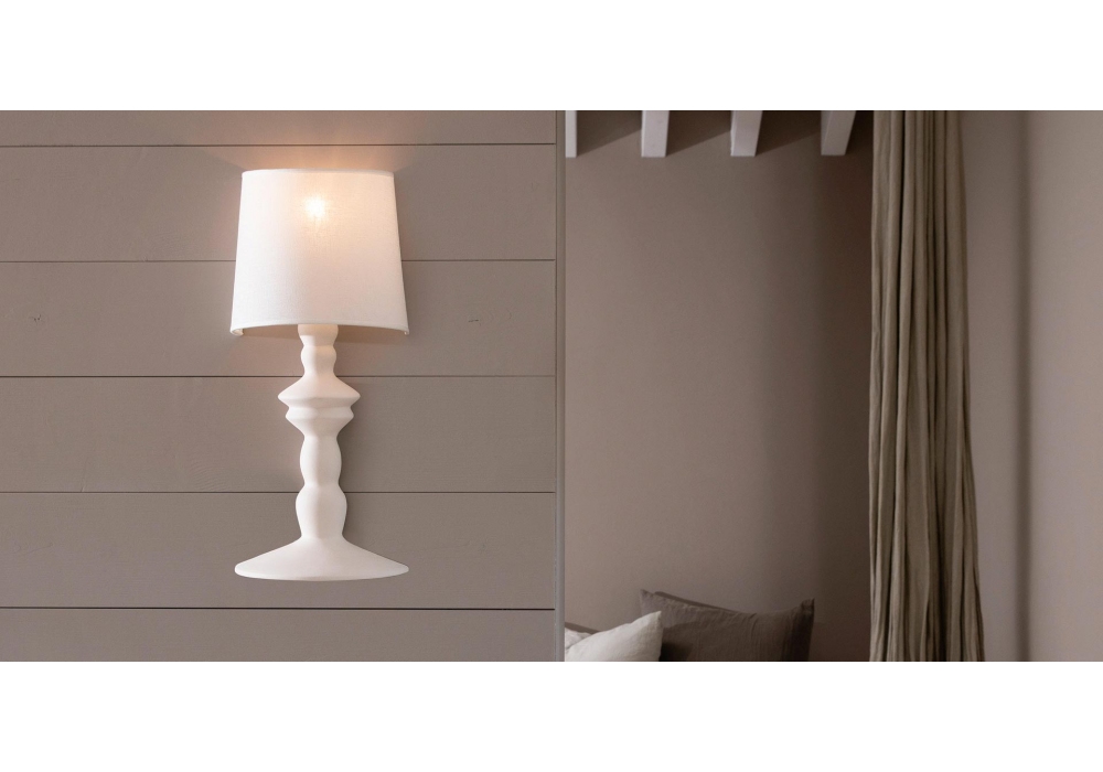 Alì E Babà firmata da Matteo Ugolini per Karman è una lampada da parete in ceramica grezza, bianco lucido o con paralume in lino bianco. Lampadina non inclusa.