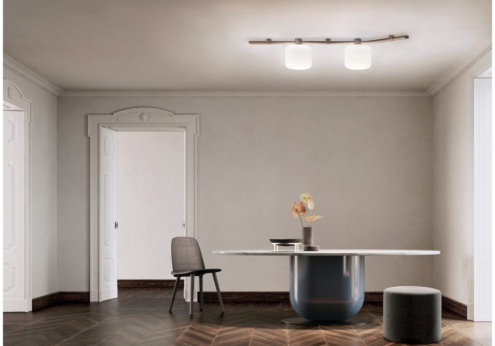 Floed 2 firmata da Storagemilano per Kundalini è una lampada da parete/soffitto con diffusori in vetro opale soffiato incamiciato e struttura in metallo verniciato con finitura bronzo.
