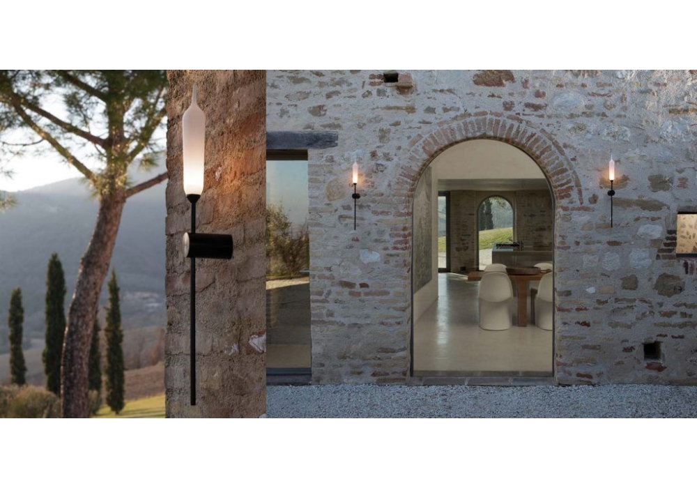 Nilo Outdoor firmata da Matteo Ugolini per Karman è una lampada da parete con struttura in alluminio nero e diffusore in resina bianca. Uso esterno.