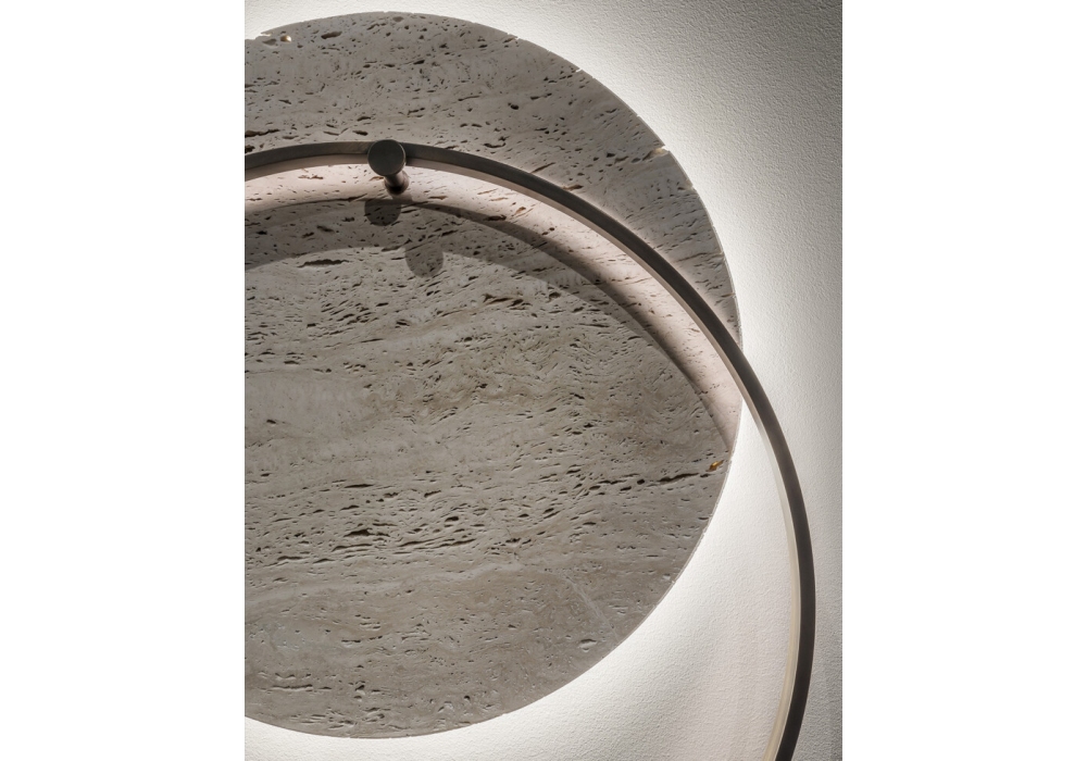 Myring firmata da Adele Martelli per Emmemobili è una lampada da parete composta da due cerchi. L’ anello è realizzato in ottone, mentre il disco può essere in legno, in ottone o in marmo. Illuminazione con strisce LED. Versione dimmerabile disponibile a richiesta e con sovrapprezzo.