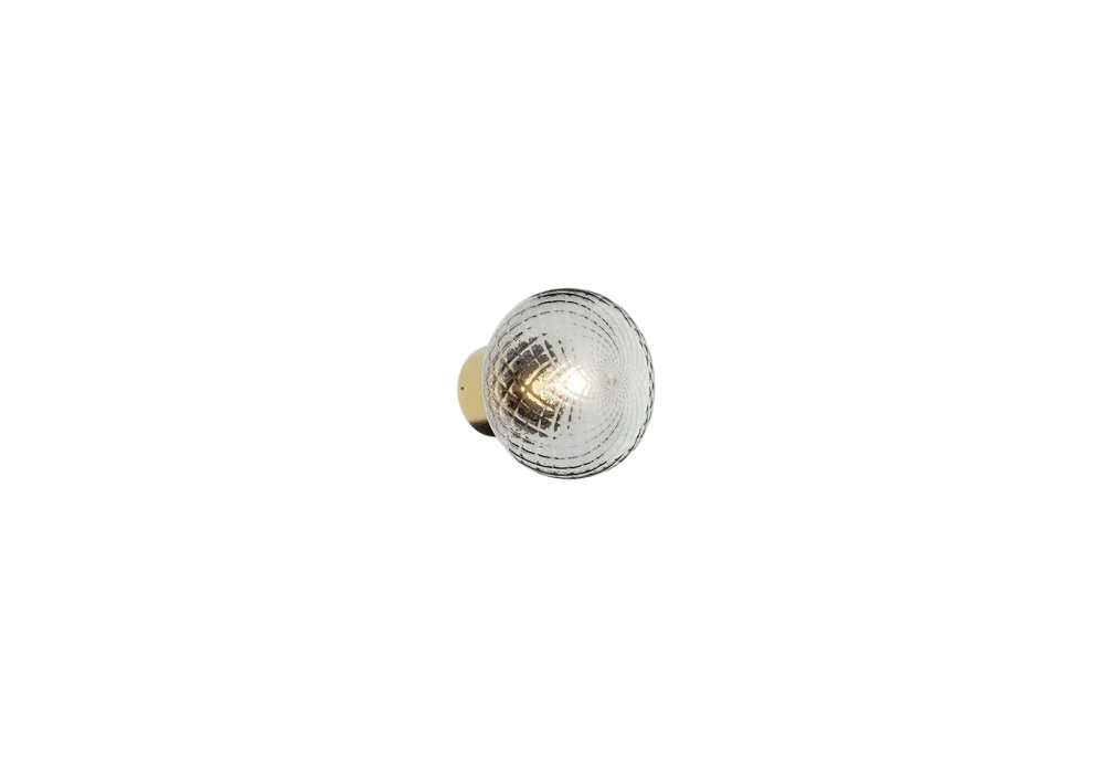 Bloom firmata da Matteo Zorzenoni per Il Fanale è una lampada da parete con struttura portante in ottone naturale. Il diffusore è di forma circolare in vetro tramato grigio trasparente e scherma una sorgente luminosa di tipo LED.