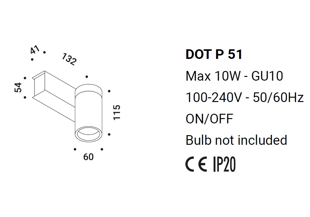 Dot P 51 progettato e prodotto da Omar Carraglia e Davide Groppi è una lampada da parete a luce diretta per uso interno, versione ON/OFF. La base è in acciaio verniciato nero opaco testurizzato o bianco opaco. Il proiettore è in alluminio dorato galvanizzato lucido, nero opaco testurizzato o bianco opaco testurizzato ed è orientabile in tutte le direzioni. Richiede una lampadina LED GU10, non inclusa.