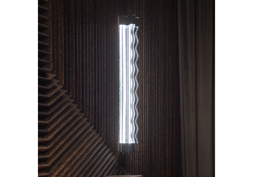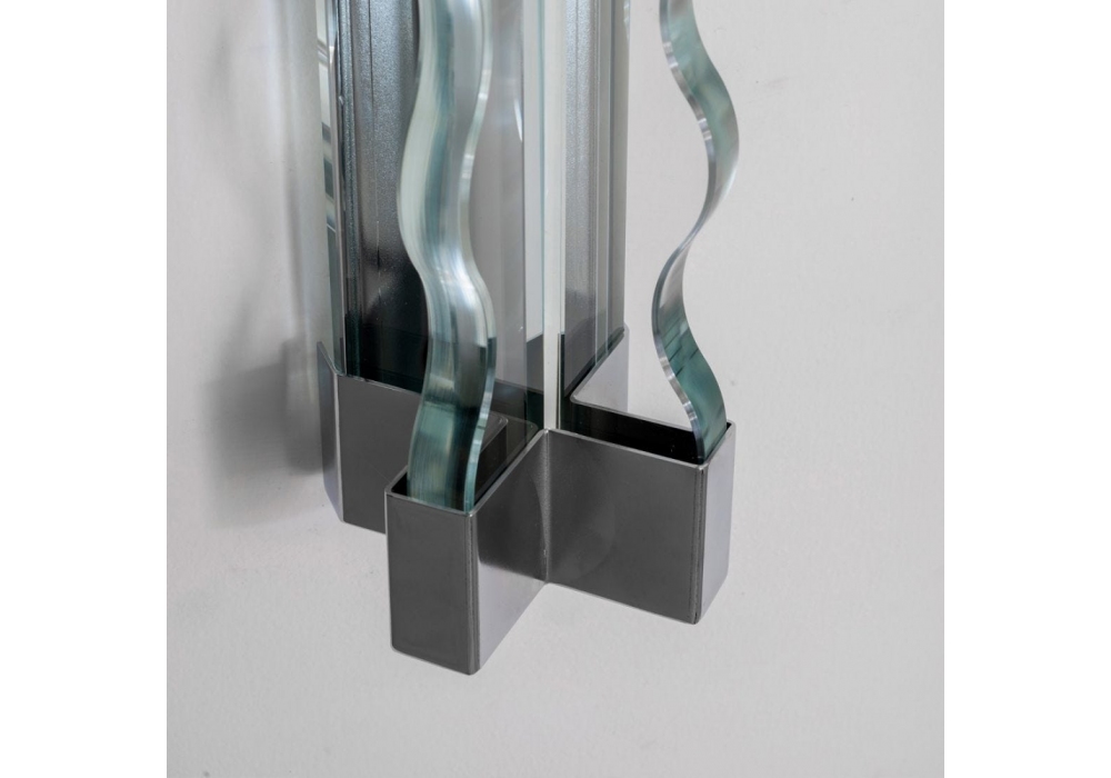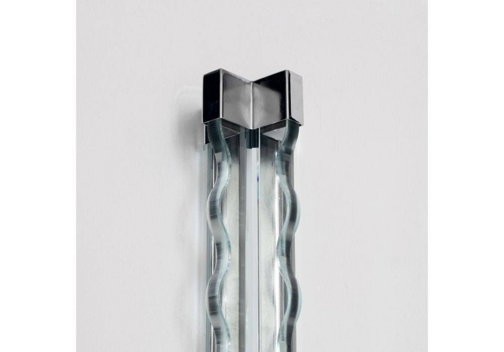 Frenesi firmata da Studio Luca Guadagnino per Fontana Arte è una lampada da parete/soffitto a luce diffusa dimmerabile. Diffusore in vetro in lastra tagliato, molato e lucidato in finitura extra chiara. Montatura in metallo cromato galvanizzato. Led integrato.