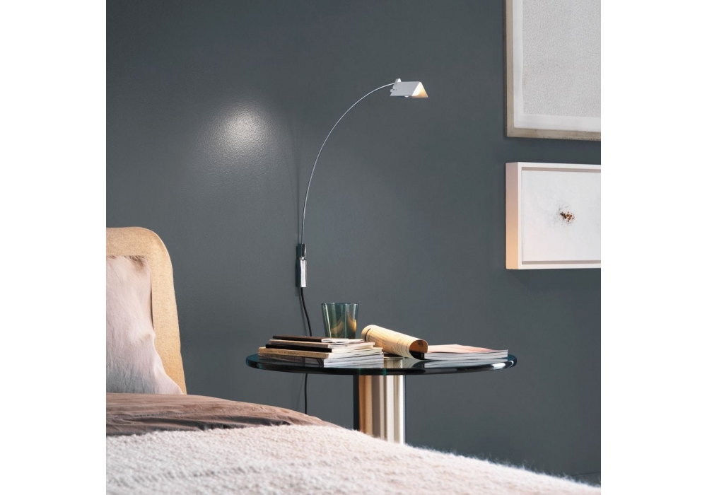 Falena firmata da Alvaro Siza per Fontana Arte è una lampada da parete a luce direzionabile a doppia intensità non dimmerabile. Struttura in metallo cromato con corpo orientabile. Alette diffusori orientabili, in alluminio anodizzato. Schermo di protezione lampadina in vetro sabbiato. Il collegamento elettrico fra lo stelo e il supporto a parete avviene tramite jack. Cavo di alimentazione, interruttore e spina neri.
