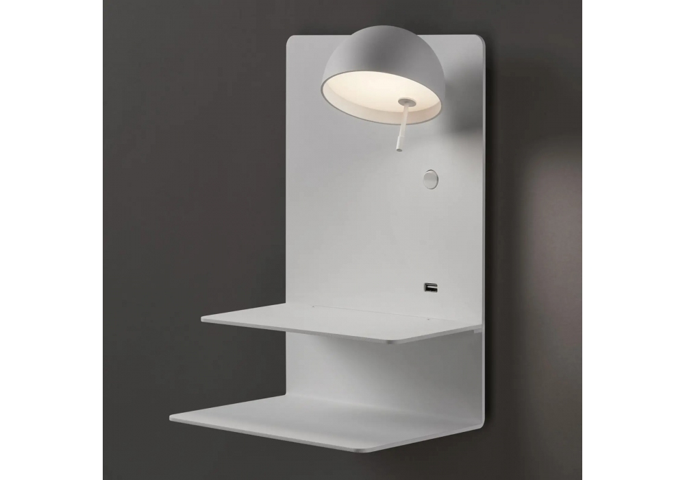 Beddy A firmata da Danos Salgados per Bover è una lampada da parete con struttura in alluminio e ferro verniciato di colore bianco con porta USB integrata. Il paralume è di forma semicircolare in alluminio con diffusore in policarbonato e scherma una sorgente luminosa di tipo LED. Beddy A è disponibile in differenti finiture.