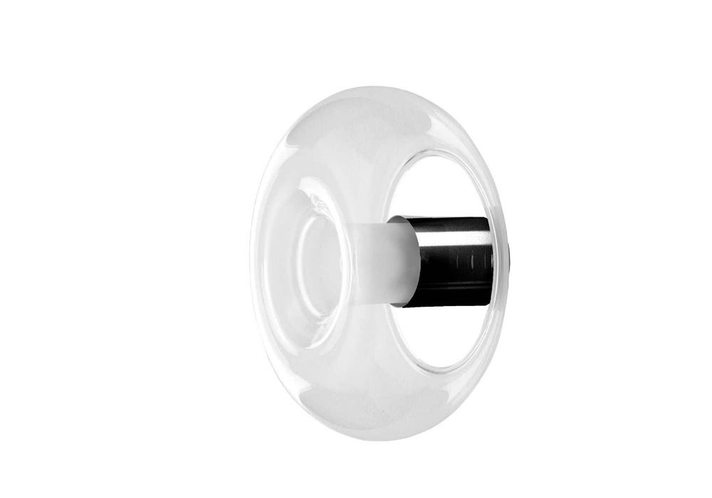 Fontanella firmata da Federico Peri per Fontana Arte è una lampada da parete/soffitto a luce diffusa dimmerabile con struttura in metallo galvanizzato e dffusore in vetro soffiato in borisilicato.