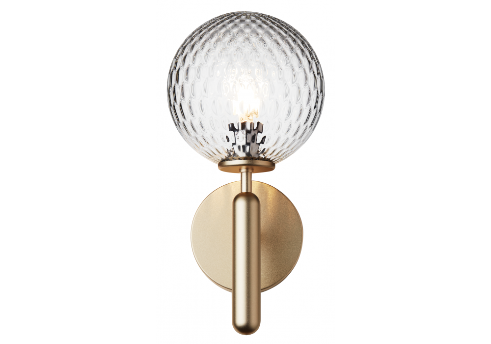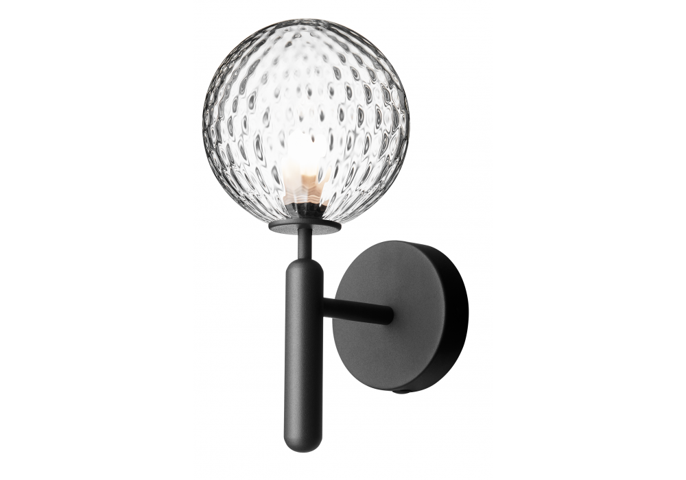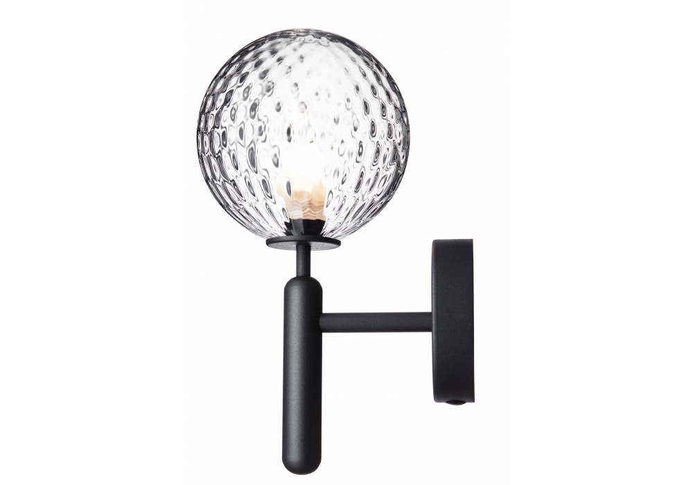 Miira firmata da Sofie Refer per Nuura è una lampada da parete con struttura in metallo lavorato e diffusore in vetro opale soffiato a bocca o trasparente con motivo in rilievo.