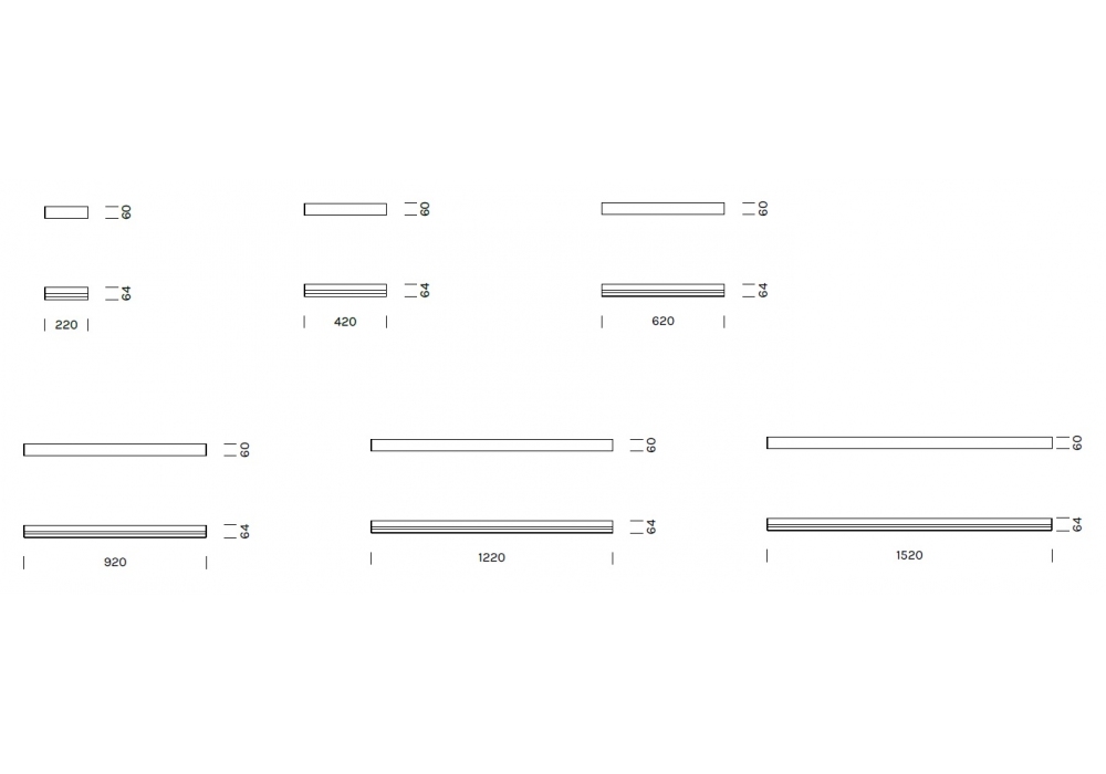 | Dimensioni | • 22 x 6 x H 6,4 cm; • 42 x 6 x H 6,4 cm; • 62 x 6 x H 6,4 cm; • 92 x 6 x H 6,4 cm; • 122 x 6 x H 6,4 cm; • 152 x 6 x H 6,4 cm |