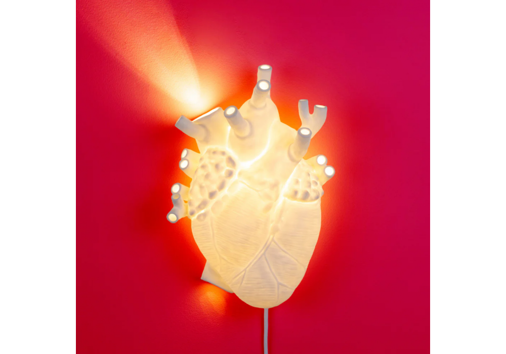 Heart firmata da Marcantonio per Seletti è una lampada da parete in finissima porcellana bianca che rappresenta l'anatomia di un cuore umano. La sorgente luminosa adottata è di tipo LED alimentata da un cavo in materiale plastico.