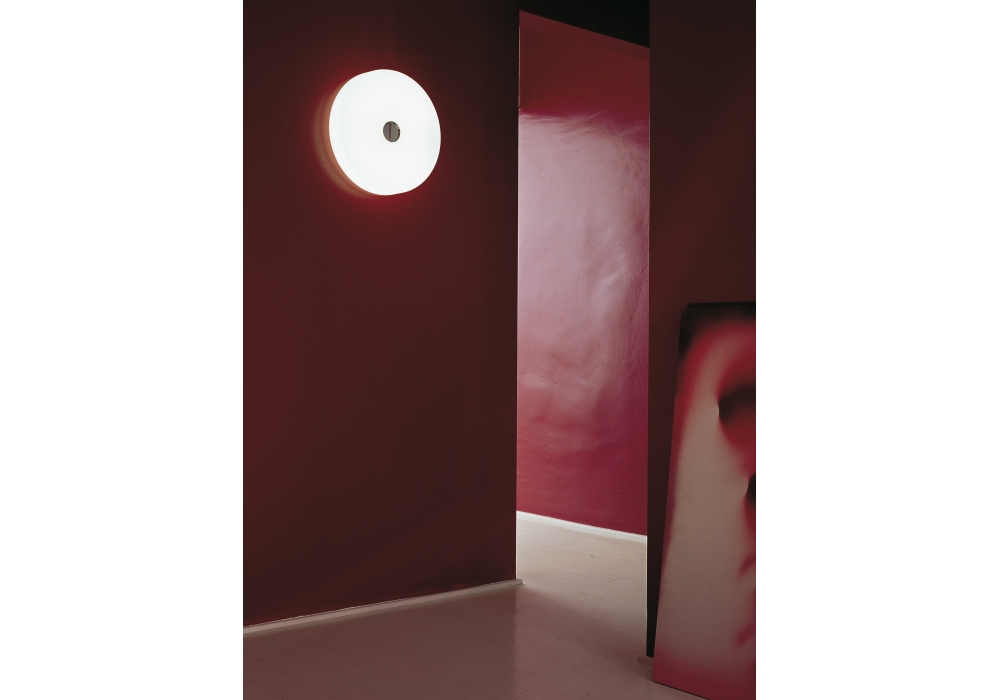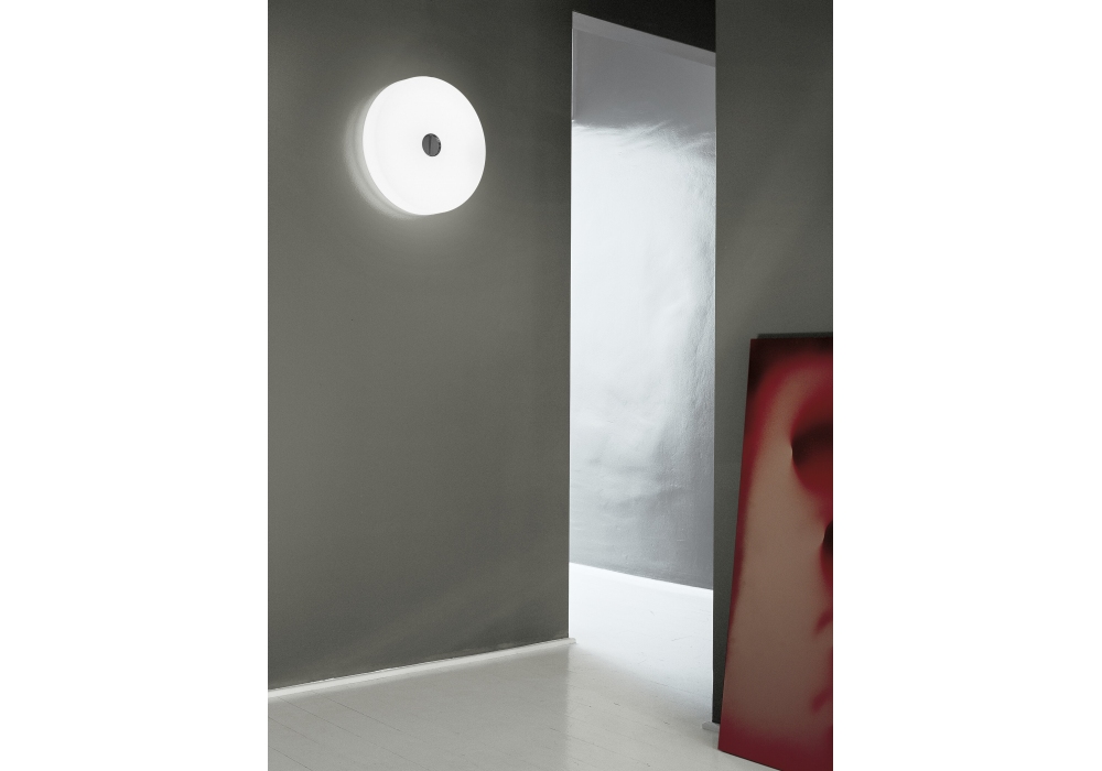 Button firmato da Piero Lissoni per Flos è un apparecchio di illuminazione fisso da parete/plafone a luce diffusa da interno. Diffusore in vetro incamiciato opale soffiato a bocca con finitura acidata. Attacco a parete in lamiera d'acciaio tranciata, imbutita con finitura zincata bianco. Riflettore in lamiera d'acciaio tranciata, imbutita e verniciata di colore bianco per alte temperature. Fregio in tecnopolimero stampato ad iniezione con finitura cromata. Regolabile da remoto (dimmer non incluso). Lampadine escluse.