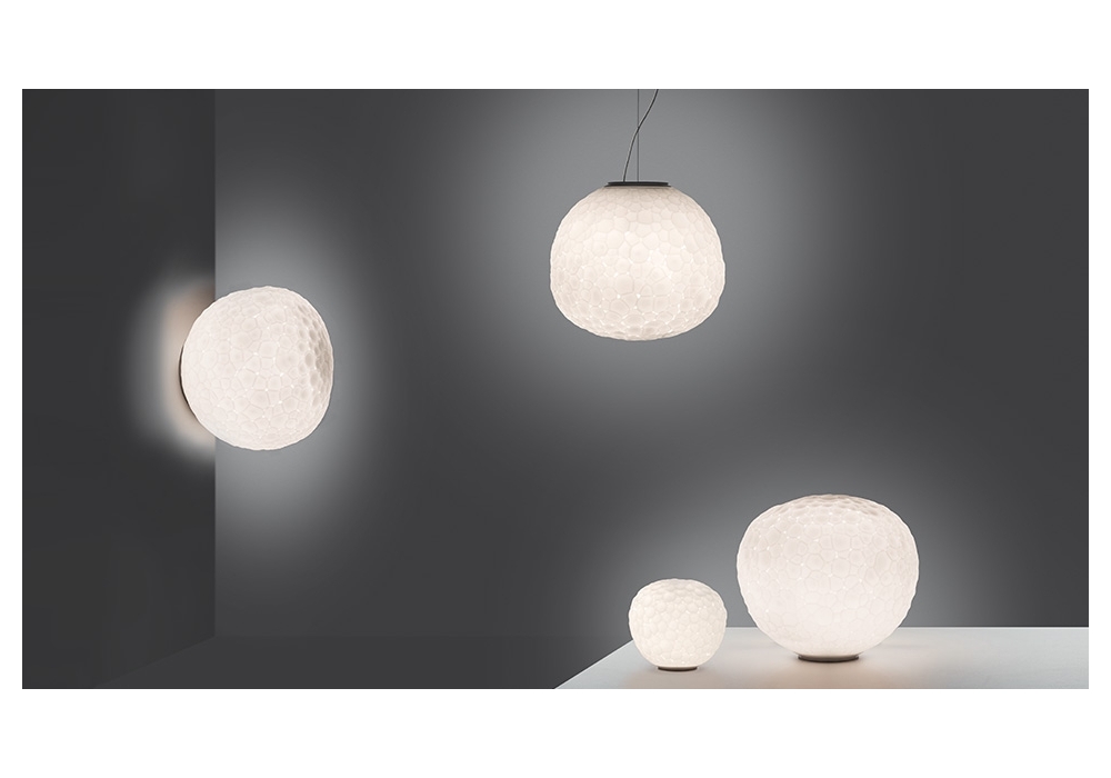 Meteorite firmata da Pio & Tito Toso per Artemide è una lampada da parete o soffitto con struttura portante in alluminio e tecnopolimero di colore bianco. Il diffusore è in vetro soffiato di forma sferica ed alloggia una sorgente luminosa di tipo LED dimmerabile. Meteorite è disponibile in differenti dimensioni.