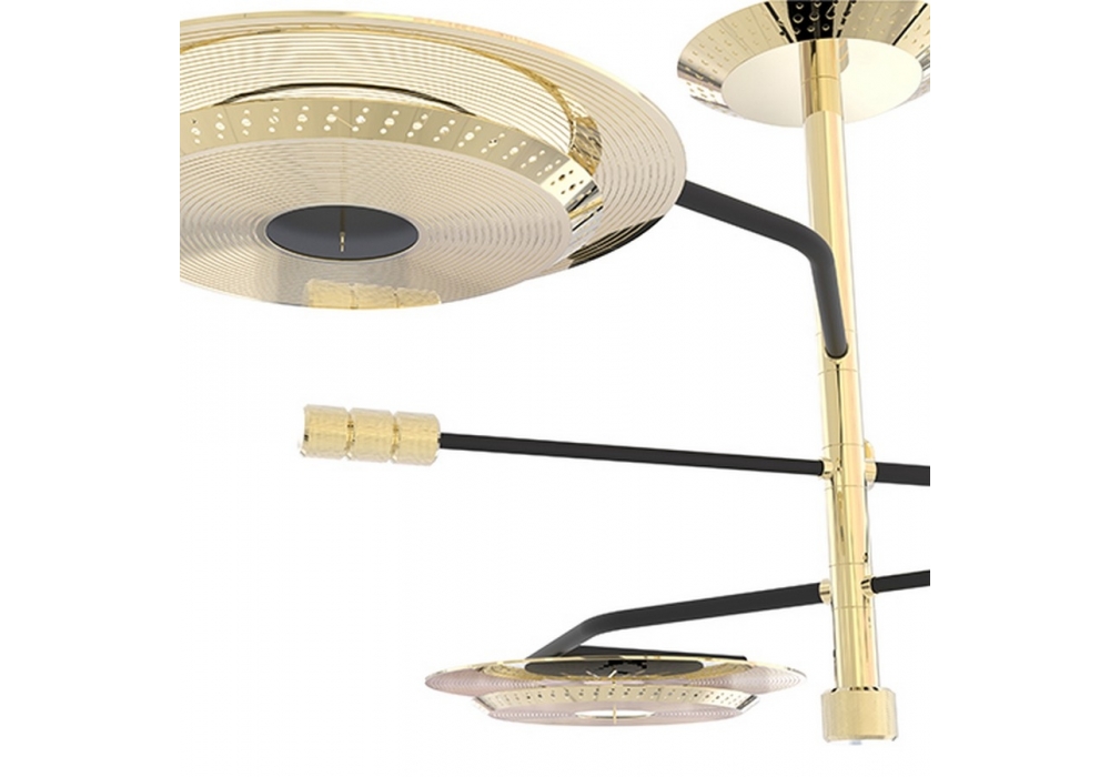 Hendrix firmata da DelightFULL è una lampada a sospensione rifinita in oro placcato e nero opaco con una struttura in ottone, ha un'altezza personalizzabile e flessibile e può essere montata su un soffitto inclinato.