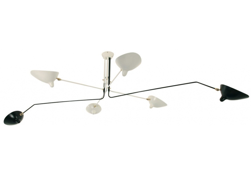 P6B firmata da Serge Mouille è una lampada da soffitto, re-edizione del modello originale del 1958.  Ha 6 aste in acciaio verniciato nero, i riflettori in alluminio laccato nero con interni bianco e i giunti in ottone. Lampadina: E27 6x42W alogeno (inclusa).