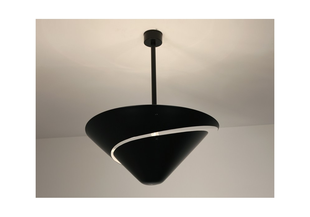 Escargot Ø 60 cm firmata da Serge Mouille è una lampada da soffitto, re-edizione del modello originale del 1955. Ha il riflettore in alluminio laccato nero con interno bianco e il giunto in ottone. Lampadina: E27 100W alogeno (inclusa).