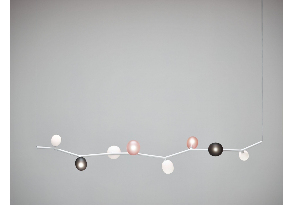 Ivy firmato da Lucie Koldová per Brokis è un sistema modulare da soffitto caratterizzato da componenti in vetro di tre dimensioni e tre colori posizionati sui rami secondo una sequenza prestabilita. Paralume in vetro con superficie acidata su entrambi i lati con sorgente luminosa di tipo LED in versione dimmerabile o non dimmerabile. Corpo in ferro verniciato opaco a polvere bianco o grigio antracite.