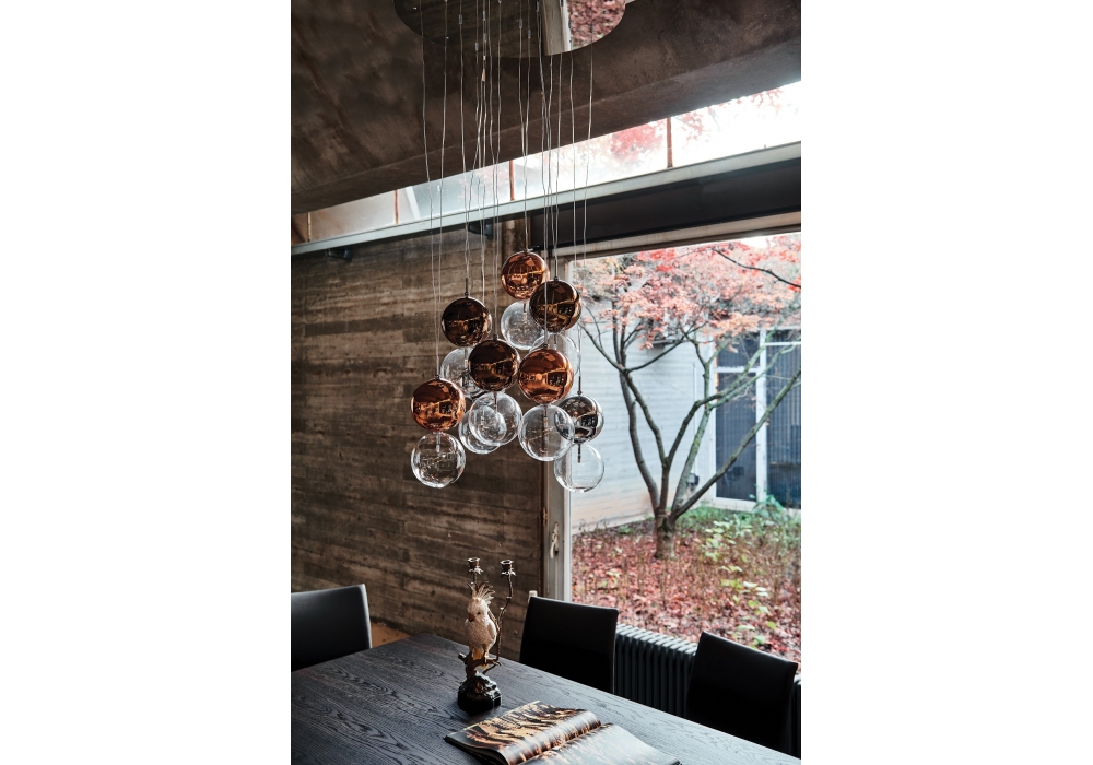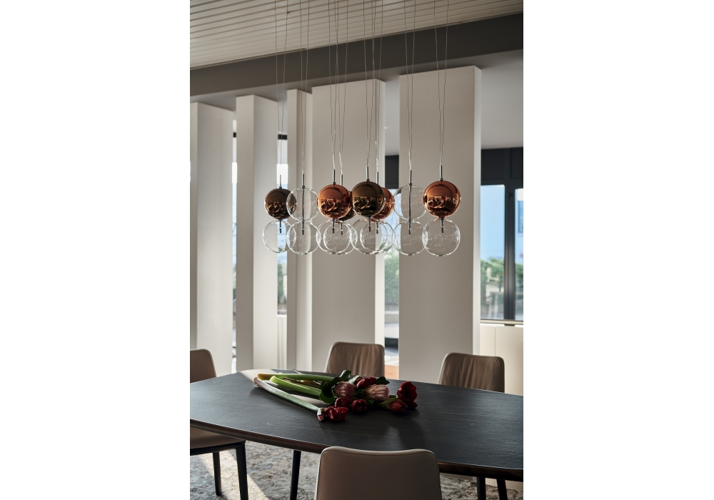 Apollo firmata da Oriano Favaretto per Cattelan Italia è una lampada da soffitto con paralume composto da 2 sfere in vetro borosilicato. Sfera inferiore in vetro trasparente e sfera superiore in vetro trasparente o verniciato cromo, rame, bronzo. Fissaggio a soffitto in acciaio inox.