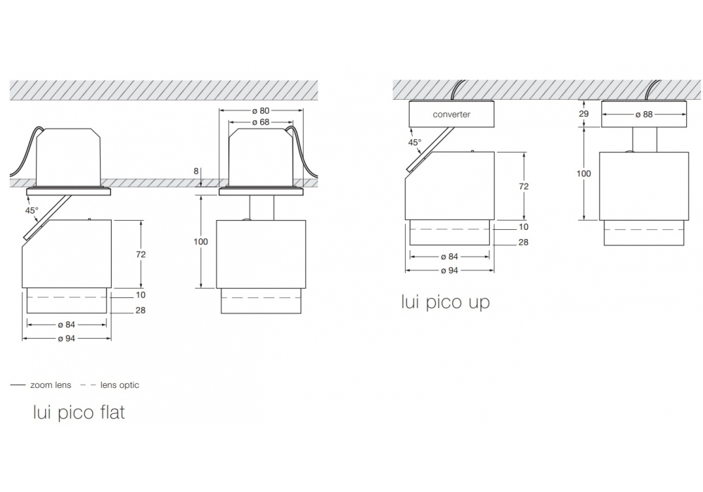 Lui Pico firmato da Occhio è un faretto da parete / soffitto con diffusore cilindrico e lenti intercambiabili, realizzato in alluminio, acciaio cromato, verniciato o anodizzato, plastica, vetro e plastica ottica. Disponibile con ottica zoom regolabile in continuo da 20° a 60° o in alternativa con lente ottica con diversi inserti. Rosone piatto per montaggio su scatola interrata o alto con alimentatore incluso.