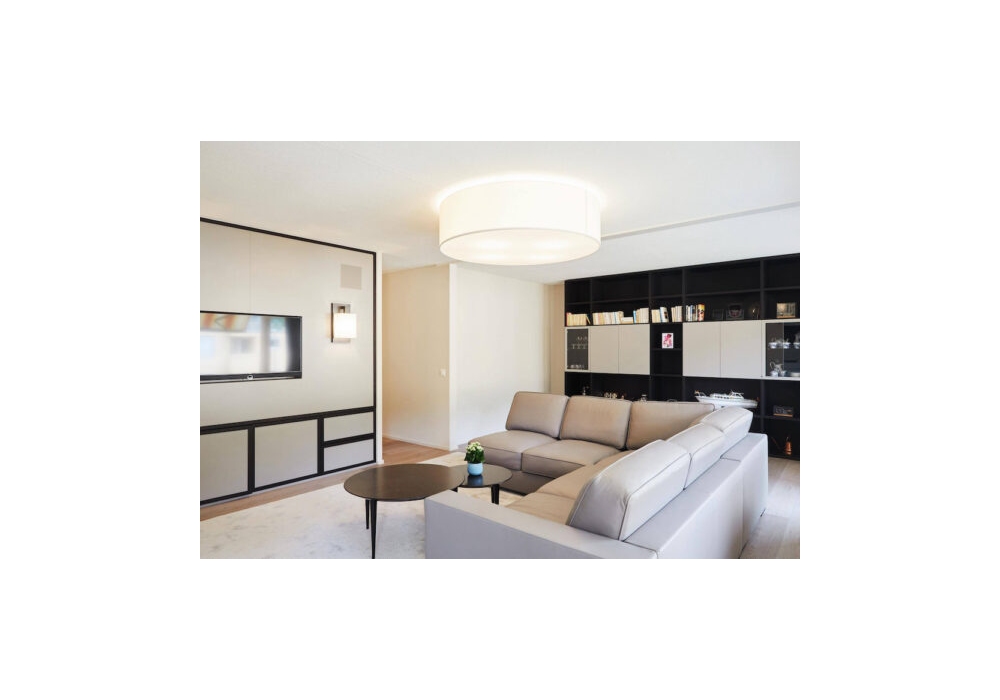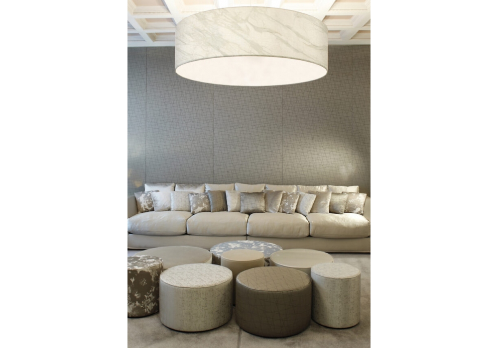 Circus firmata da Contardi Studio è una lampada da soffitto composta da struttura laccata bianca e paralume in cotone, lino, tessuto effetto marmo o tessuto bouclè.