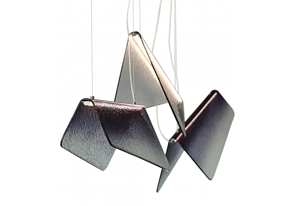Velar firmata da Carlo Rocchetti per Cattelan Italia è una lampada da soffitto a LED con paralume in vetro artistico decorato, trasparente o blu fumé. Placca a soffitto in acciaio cromato nero.