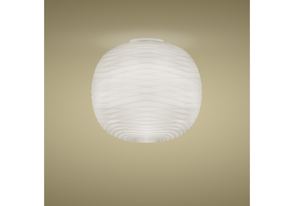 Gem firmata da Ludovica & Roberto Palomba per Foscarini è una lampada da soffitto con struttura portante in metallo verniciato bianco e diffusore sferico in vetro soffiato bianco acidato con superficie a rilievo. La sorgente luminosa adottata è con innesto E27 LED retrofit dimmerabile con tecnologia Triac.