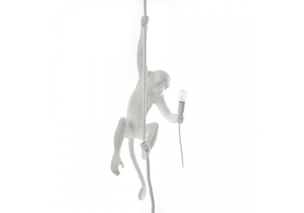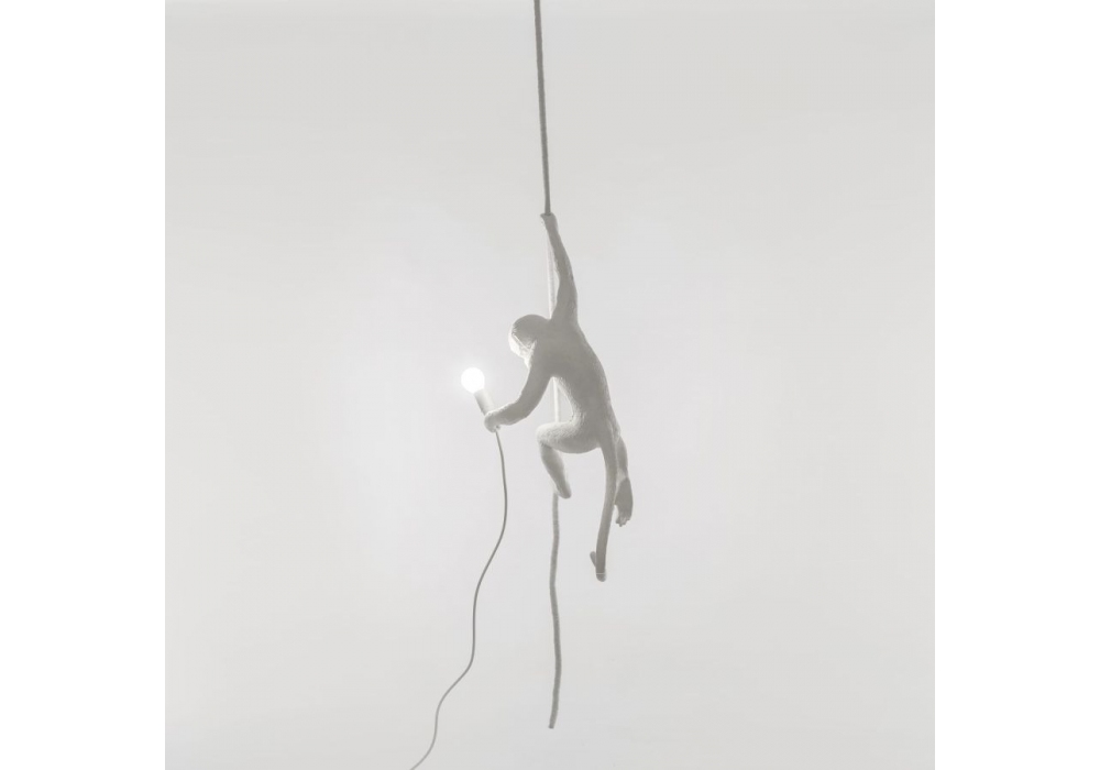 The Monkey Lamp firmata da Marcantonio Raimondi Malerba per Seletti è una lampada da soffitto realizzata in resina bianca e sorretta da una corda in tessuto. La sorgente luminosa adottata è di tipo LED a filamento.