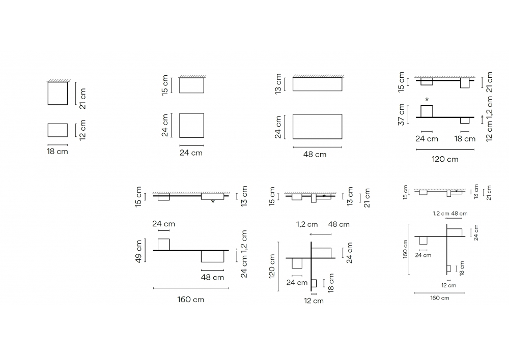 | Dimensioni | 18 x 12 x H 21 cm; 24 x 24 x H 15 cm; 48 x 24 x H 13 cm; 120 x 24 x H 37 cm; 160 x 24 x H 49 cm; 120 x 120 x H 13 cm; 160 x 160 x H 24 cm. |