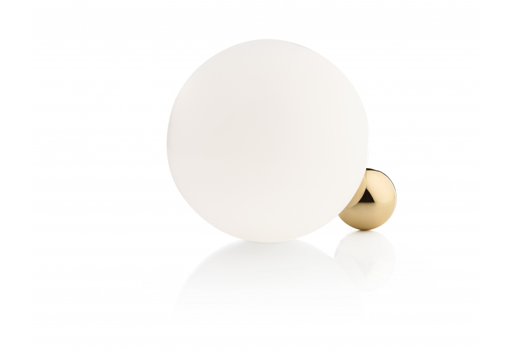 Copycat firmato da Michael Anastassiades per Flos è un apparecchio di illuminazione da tavolo composto da una sfera di alluminio lavorata dal pieno e successivamente dorata con bagno in oro 24 K. Diffusore opalino di vetro soffiato. Fonte luminosa LED con interruttore dimmer lungo il cavo di alimentazione.