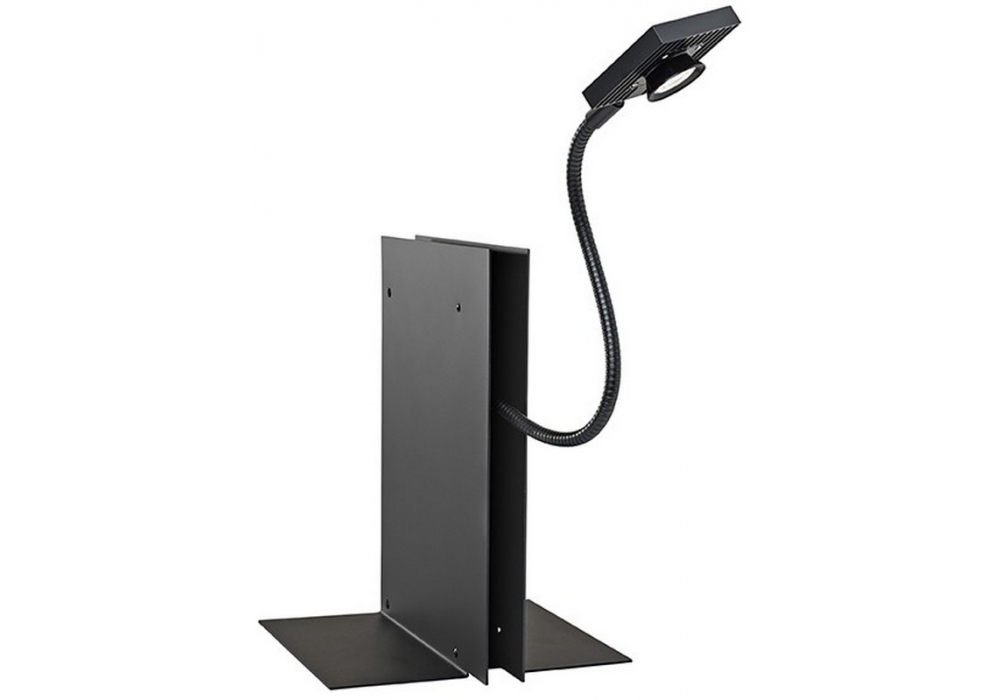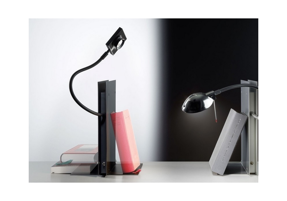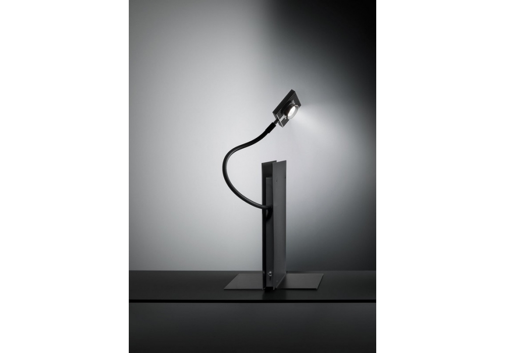 LED's Oskar firmata e prodotta da Ingo Maurer è una lampada da tavolo con braccio metallico flessibile che permette la regolazione variabile del riflettore. La struttura è in alluminio anodizzato nero e metallo.