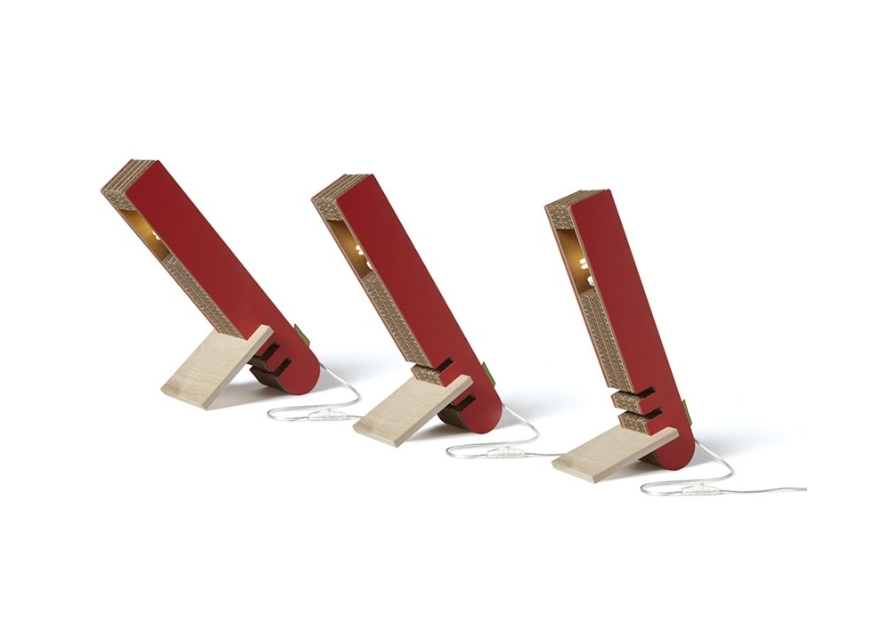 Regolo di Kubedesign è una lampada da tavolo in cartone. L’ elemento di appoggio in legno di betulla permette di variare l’inclinazione del fascio di luce a seconda delle necessità dell’utente. La struttura è rivestita da materiale rigido antiurto disponibile nei colori bianco, nero e rosso.