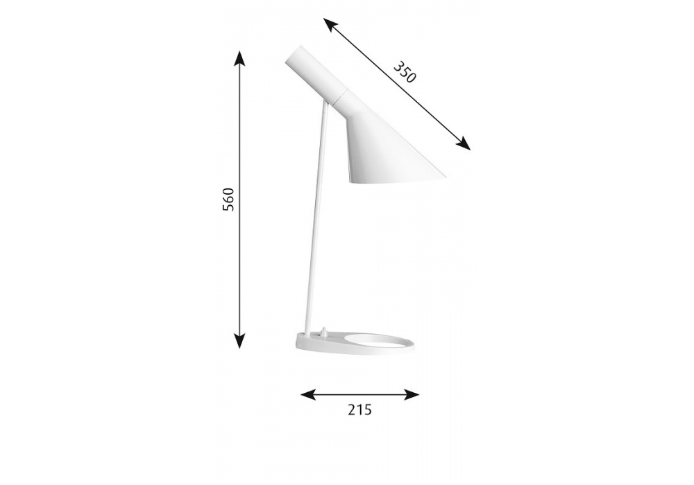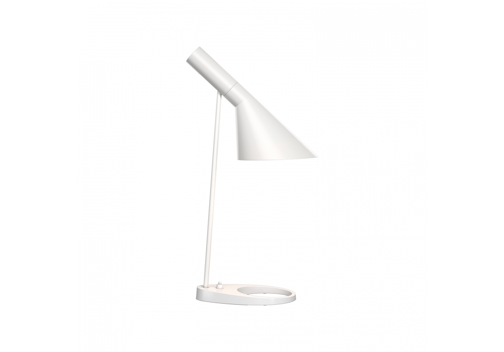 AJ firmata da Arne Jacobsen per Louis Poulsen è una lampada da tavolo con base in zinco o acciaio inox e sostegno in acciaio inox verniciato. Il diffusore è in acciaio inox e scherma una sorgente luminosa con innesto E27 di tipo LED o alogeno. AJ è disponibile in differenti finiture.