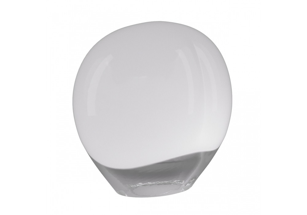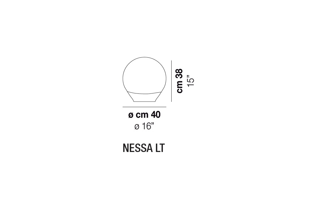 Nessa prodotta e firmata da Vistosi è una lampada da tavolo di forma tondeggiante interamente realizzata in vetro soffiato. La parte bassa è trasparente mentre la parte alta è di colore bianco e scherma una sorgente luminosa con innesto E27 di tipo LED o alogena con switch on/off su cavo di alimentazione.