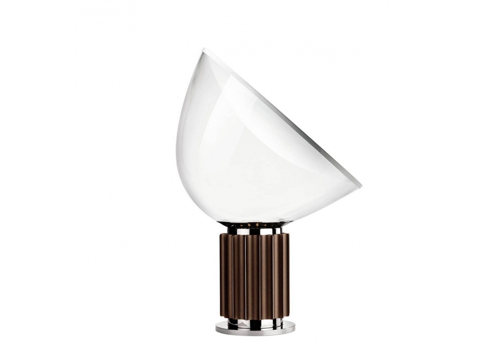 Taccia firmato da Achille & Pier Giacomo Castiglioni per Flos è un apparecchio di illuminazione da tavolo a luce indiretta e riflessa. Riflettore in alluminio verniciato bianco lucido esternamente e bianco opaco internamente. Diffusore orientabile in PMMA trasparente. Corpo in alluminio estruso verniciato. Base in metallo nickelata. Cavo elettrico con interruttore dimmer che garantisce le funzioni ON/OFF e regolazione del flusso luminoso 10-100%. Power supply su spina con plug intercambiabili. Fonte luminosa LED inclusa.