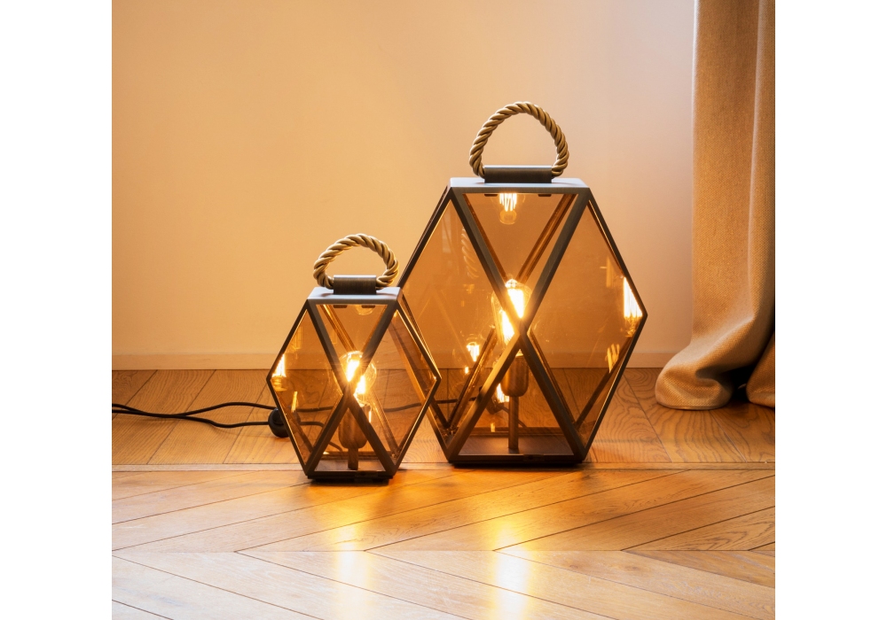 Muse Lantern firmata da Tristan Auer per Contardi è una lampada da tavolo o terra con struttura portante in bronzo spazzolato. Il diffusore è in acrilico color ambra e scherma una sorgente luminosa di tipo LED dimmerabile. Il cavo di alimentazione è in tessuto nero con interruttore on/off o pedale dimmer e pratica maniglia in seta intrecciata color miele. Muse Lantern è disponibile in differenti dimensioni e versioni.