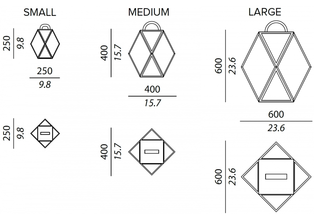 | Dimensioni | Small: 25 x 25 x H 25 cm; Medium: 40 x 40 x H 40 cm; Large: 60 x 60 x H 60 cm. |