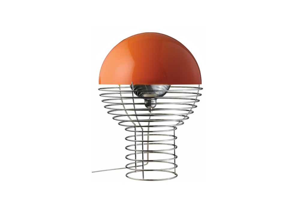 Wire firmata da Verner Panton per Verpan è una lampada da tavolo con struttura cilindrica in filo metallico che si allarga a semisfera in cima. Paralume emisferico in plastica bianca o arancione. Sul cavo di alimentazione è presente un interruttore on/off trasparente.
