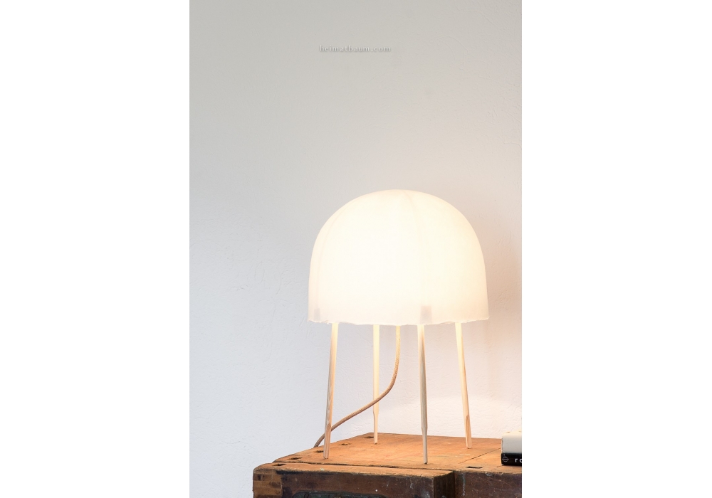 Kurage firmata da Luca Nichetto e Nendo per Foscarini è una particolare lampada da tavolo realizzata in carta Washi giapponese e legno di frassino. La sorgente luminosa adottata è con innesto E27 alimentanta da un cavo color carta naturale in fibbra tessile.