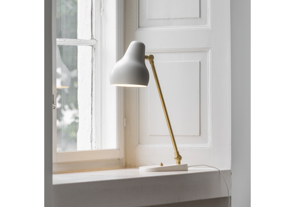 VL38 firmata da Vilhelm Lauritzen per Louis Poulsen è una lampada da tavolo con base in alluminio pressofuso verniciato e stelo in ottone spazzolato. Il diffusore è in alluminio tirato verniciato e scherma una sorgente luminosa di tipo LED alimentata da un cavo in materiale plastico con switch on/off. VL38 è disponibile in differenti finiture.