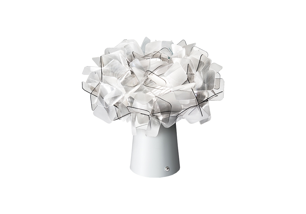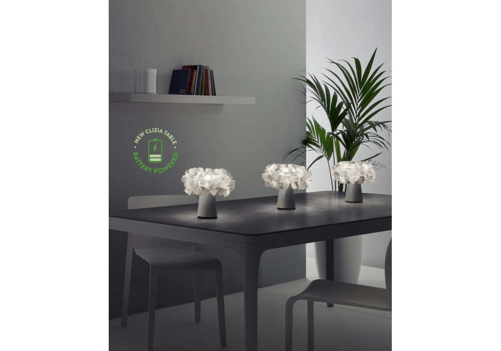 Clizia Battery firmata da Adriano Rachele per Slamp è una lampada da tavolo ricaricabile con base leggermente conica in policarbonato. Il diffusore è in Cristalflex® o Lentiflex® e scherma una sorgente luminosa di tipo LED. Clizia Battery è disponibile in differenti finiture.